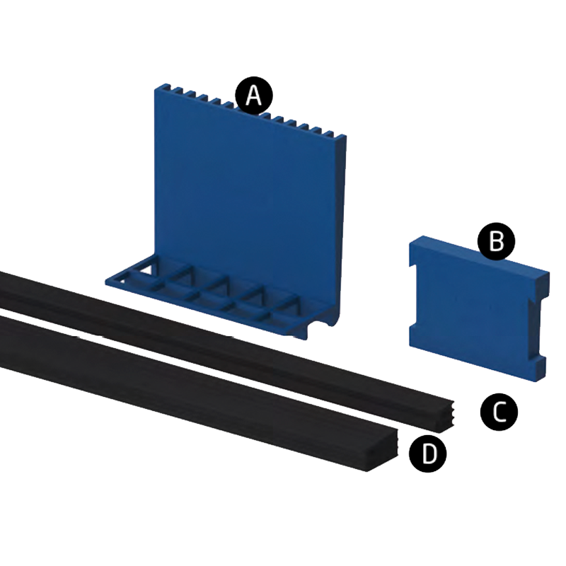 Juego de calzos, empaques de EPDM y gomas para vidrio de 12.7mm (Modelo PL-160). *El vidrio no necesita ser taladrado. **Sistema de fijación con cuñas.