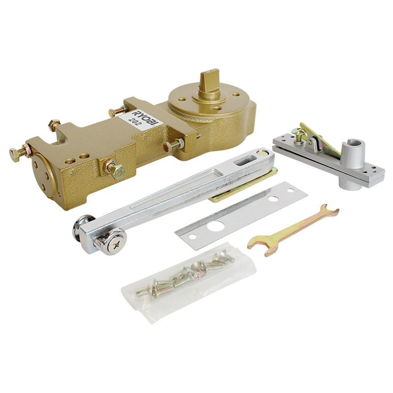 Bisagra de piso Ryobi modelo 202N, es ideal para accesos con aire acondicionado ya que cierra desde cualquier apertura, probada en laboratorio por más de 1´000,000 de ciclos. Peso Máximo 130Kg Ancho Máximo 950mm Alto Máximo 2100mm Sin freno